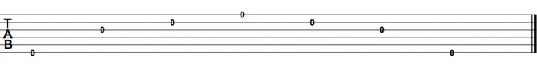 So in the next example, (reading from left to right) you would play the low E string open (pick the string with your right hand, using a plectrum, and without fretting the string), followed by the G, B and e strings open, and then descend back down through them. This is an E minor arpeggio which Metal fans might recognise this as the intro to Metallica’s ‘Nothing Else Matters’.